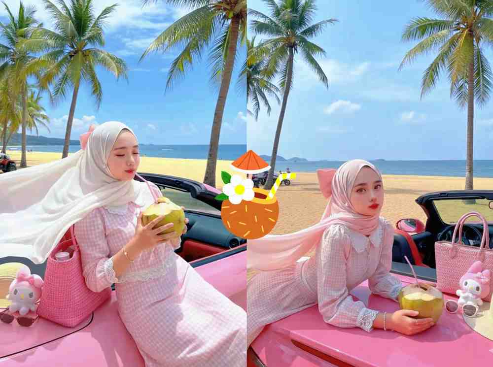 Kunci dari keajaiban ini adalah penggunaan *prompt* atau instruksi yang tepat. Pengguna memberikan deskripsi detail mengenai suasana yang diinginkan, mulai dari lokasi, gaya pakaian, hingga detail kecil seperti aksesori. Dalam kasus ini, Gemini AI menciptakan suasana musim panas yang cerah dengan sentuhan warna pink yang dominan, lengkap dengan latar belakang pantai yang eksotis. Seorang wanita berhijab tampil anggun dalam balutan busana yang stylish, memancarkan aura liburan mewah yang memukau. Bayangkan, hanya dengan beberapa instruksi, AI mampu menghasilkan gambar yang seolah-olah diambil oleh fotografer profesional di lokasi impian.