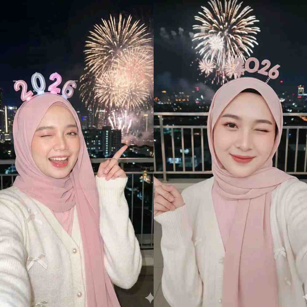 Prompt yang digunakan memerintahkan AI untuk: mempertahankan struktur wajah asli 100%, termasuk bentuk mata, hidung, bibir, dan fitur wajah lainnya; menggambarkan wanita berhijab dengan gaya cute feminin mengenakan hijab pashmina soft pink; menambahkan bando lampu berbentuk angka ‘2026’ yang imut; memberikan detail outfit berupa inner blouse pastel dan cardigan rajut putih; serta menerapkan makeup ala Douyin dengan kulit dewy, blush pink, dan bibir glossy. Selain itu, prompt juga mengatur pose selfie dengan ekspresi wink sambil tertawa kecil, latar belakang rooftop malam hari dengan kembang api meriah, serta pencahayaan cinematic yang memukau.